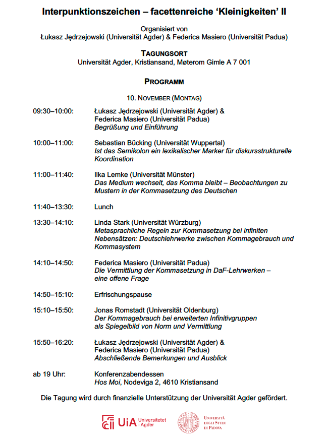 The conference Punctuation Marks – Multifaceted ‘Little Things’ was initiated by Federica Masiero (University of Padua). The inaugural meeting took place at the University of Padua in September 2024. The conference proceedings will be published by Weidler Verlag. The program of the conference is listed below and can also be downloaded here.